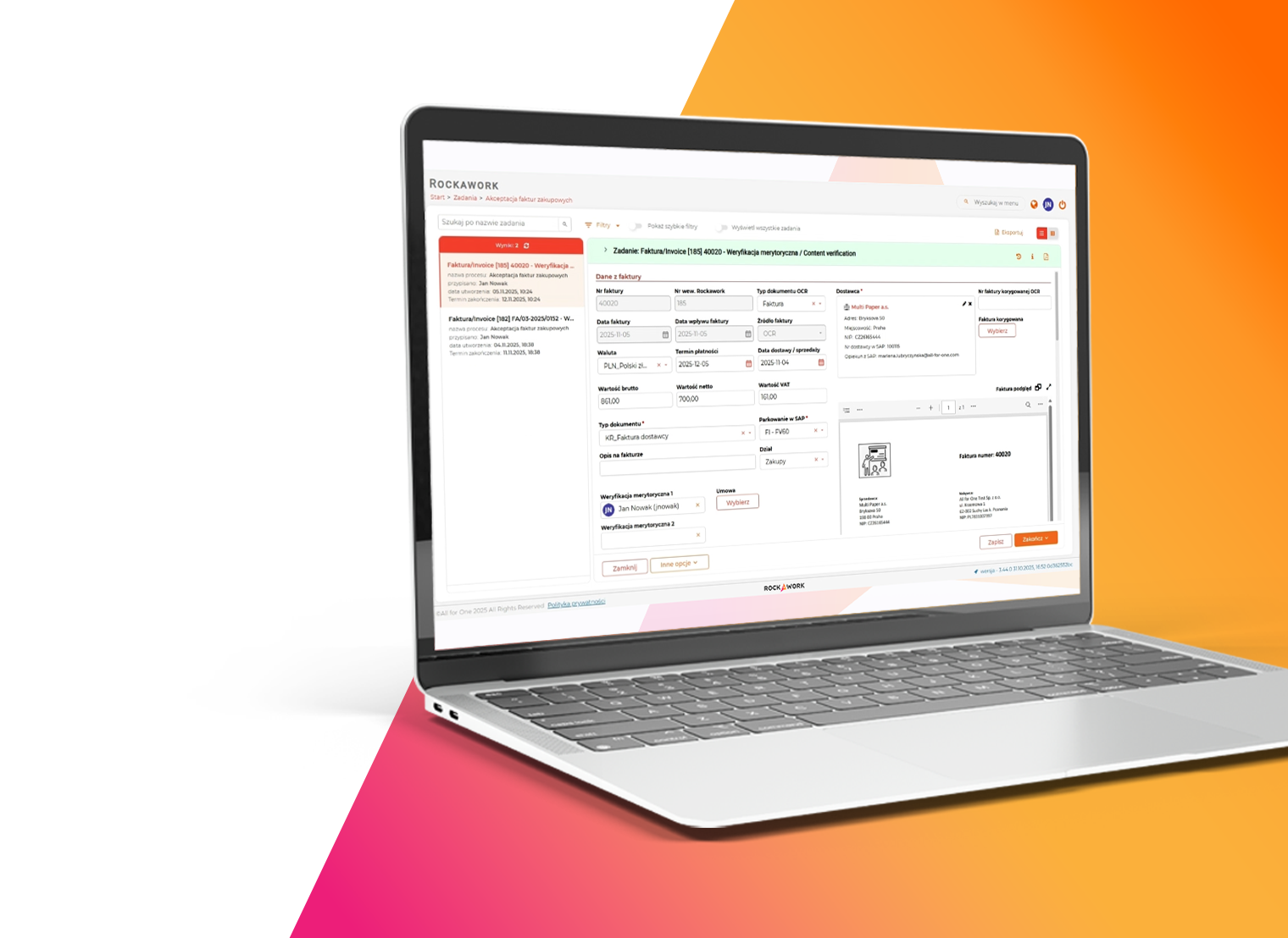 Obieg i akceptacja faktur zakupowych to jeden z krytycznych procesów cash flow w każdej organizacji. Szczególnie firmy, które ewidencjonują dużą, liczoną w tysiącach liczbę faktur, potrzebują narzędzia, które pozwala ten proces usystematyzować i uporządkować. Eliminacja obiegu dokumentów w formie papierowej to kolejna korzyść. Rockawork to kompleksowe i elastyczne rozwiązanie, wspierające digitalizację dokumentów, archiwizację i ich obieg, w tym wsparcie nieograniczonej liczby faktur zakupowych.
